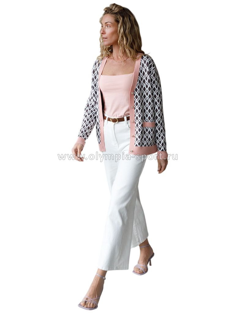 Кардиган с V-вырезом жаккардовой вязки — универсальная и женственная вещь для весны и лета. Жакет кофейно-белого цвета выполнен из приятной к телу вискозы, отличается в меру свободным кроем, который подчеркивает силуэт. V-вырез подчеркивает зону декольте и визуально вытягивает шею, делая фигуру более изящной. Спущенная линия плеча создает расслабленный силуэт, добавляя комфорта и свободы движений, что отлично подойдет для девушек и женщин плюс сайз размеров. Модель на пуговицах обеспечивает удобство в носке и добавляет классическую нотку образу. Контрастная отделка гармонично сочетается с выразительным геометрическим рисунком, который придает образу индивидуальность и современность. Принт немного напоминает благородный орнамент аргайл, Карманы-обманки украшают, сохраняя лаконичность внешнего вида, Кардиган средней длины оптимален для создания разных комбинаций на каждый день. Такой жакет легко впишется в офисный или повседневный образ благодаря своей универсальности и современному стилю. Вискоза дарит ощущение комфорта даже в теплую погоду, а качественная жаккардовая вязка сохраняет форму после стирки.