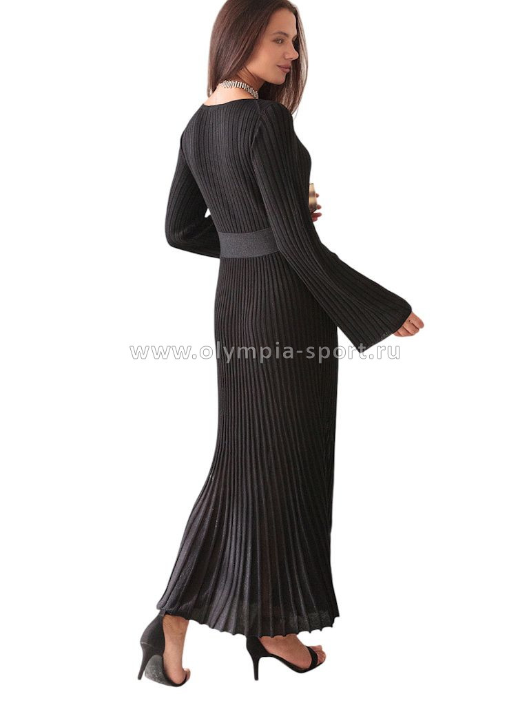 Платье А-силуэта выполнено из вискозы тонкой вязки с мягким люрексом. Модель с V- вырезом сидит по фигуре, подчеркивая женственные изгибы тела. Поперечная резинка на талии визуально делает талию уже, создавая эффект песочных часов. Юбка со складками в стиле "гофре" струится по бедрам. Изящный блеск пряжи позволяет носить изделие, как на торжественный выход, так и в повседневной жизни.